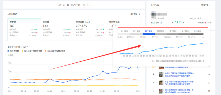 2、如果你已经在3-5这个层级内了,从10月份开始,你以周为单位,每周增加一些在直通车上面的花销。我们可以把日限额慢慢的去增加,只开精准词,多开计划。因为在这段时间买家观望,所以转化率会下降,你可以通过一些店铺内的活动来拉升一下你的转化率。在这个期间因为整体市场的原因,所有同行的转化都在下降,支付宝成交金额也都在下降,而你甚至可以做到再上升一下,一升一降,你的层级排名会上升的比较快。这样可以保证你的排名是一直上升的,即使在双十一来的时候,你的层级没有突破,也会得到搜索引擎的青睐,因为你的层级内排名在持续稳定的上升。