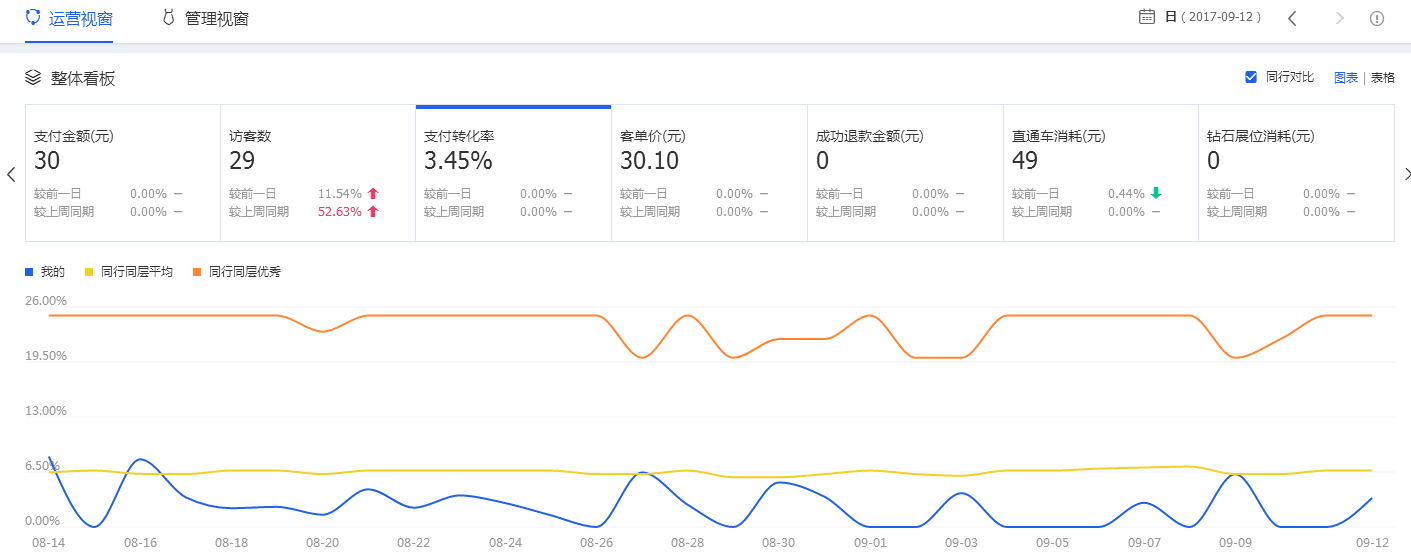 那么熟先,再整体看把里面找到这样一下数据“支付转化率”,那么在正常的情况下,这个数据最好是跟访客同步的,那么也就是说在行业均值和行业优秀之间,如果说你的数据是在行业优秀的附近就更加好了,不然的话不管怎么样都会出现问题,那么是臭问题就有以下三种情况: